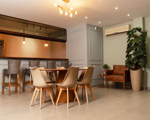 Nosso espaço de eventos foi pensado para proporcionar conforto e cuidado, oferecendo um ambiente acolhedor e elegante para qualquer ocasião e garantindo que você e seus convidados desfrutem de uma experiência muito agradável para seu evento ser um sucesso.